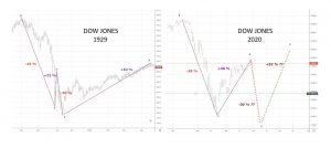 La razón del título de este artículo, se deriva de los dos gráficos que a continuación se muestran, o bien repite su comportamiento similar a 1929 o a las últimas dos crisis financieras (2000 o 2008), pero finalmente en ambos casos, no se lucen bien para los meses venideros, no crean que al terminar la pandemia, se compone todo, el horror en los mercados financieros apenas comienza. Abróchense los cinturones.